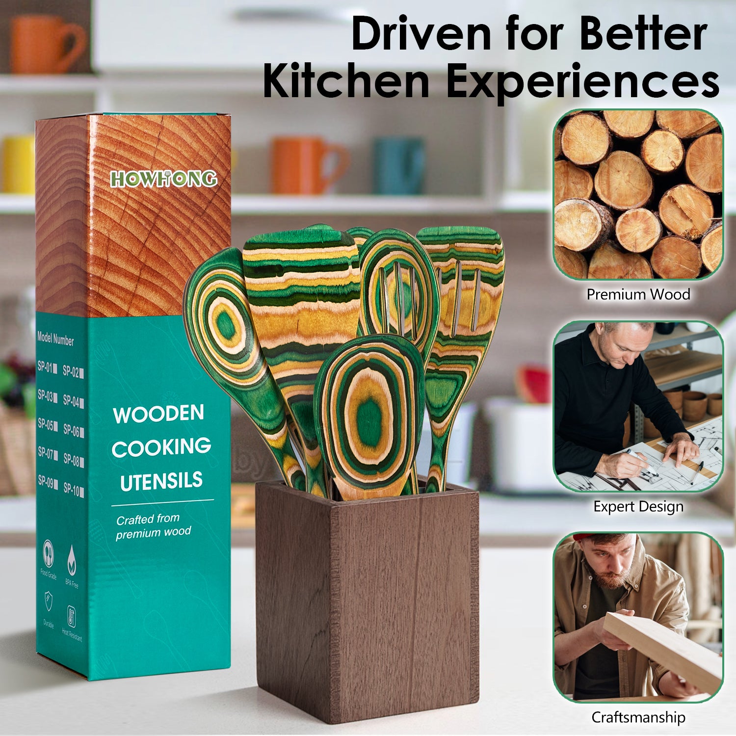 HOWHONG Pakkawood 7-Piece Wooden Cooking Utensil Set - Wood Kitchen Utensil Set, Wooden Spoons for Cooking and Serving, Nonstick Safe Non-Toxic Wooden Cooking Tools (Oasis Color)