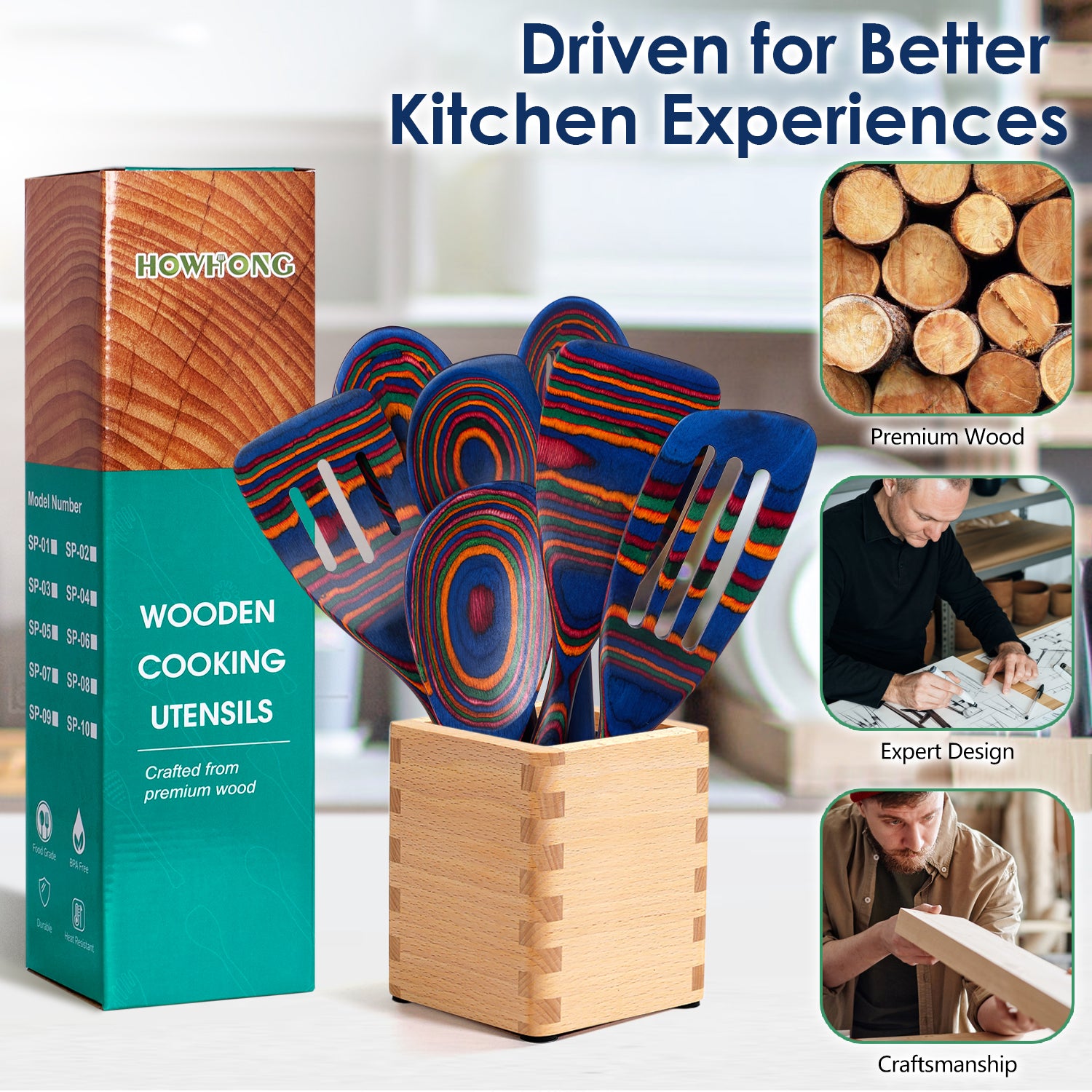 HOWHONG Pakkawood 7-Piece Wooden Cooking Utensil Set - Wood Kitchen Utensil Set, Wooden Spoons for Cooking and Serving, Nonstick Safe Non-Toxic Wooden Cooking Tools (Spectrum Color)